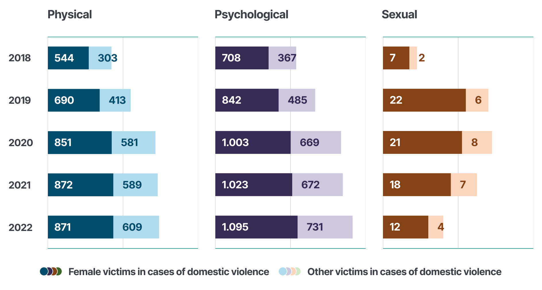 For instance, victims in cases of domestic violence means all victims that were recorded in a case that, among other offences, included domestic violence. Therefore, not all victims were necessarily victims of domestic violence, however, as the exact number cannot be established, all victims identified in the case involving domestic violence are counted. Similarly, cases that include females mean that, among all victims in a case, at least one female was identified, and, while the case was recorded as being against a female victim, not all victims in the case were necessarily females.