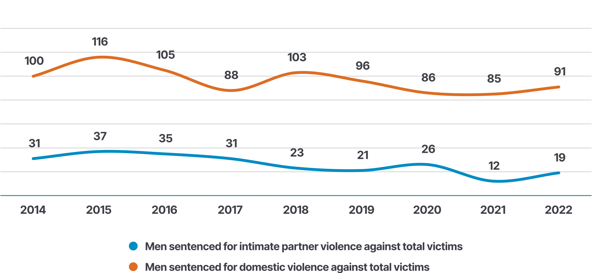 In 2022, 19 men were sentenced for intimate partner violence against total victims. In the same year, 91 men were sentenced for domestic violence against total victims.