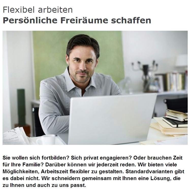 A specific emphasis is given to executives taking family-friendly working hours, so that they can act as disseminators and role models. For a period of three months executives can try out working flexibly from home or part-time – which helps to create a cultural change in the organisation and leadership around flexible working. After the trial period, executives are free to go back to their full-time posts, but in practice 80% of them decide to continue to work flexibly.